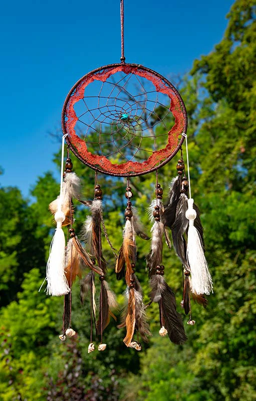 Der Legende nach wurde die Idee des Traumfängers den amerikanischen Ureinwohner*innenin Visionen übermittelt. Gesponnen wie das Netz einer Spinne, agiert der Traumfänger als Filter, der negative Gedanken und Träume von den Guten trennt und nur das durchlässt, was uns Menschen hilft, ungehindert den für uns richtigen Weg zu gehen. über dem Bett wirkt er als kraftvolles Schutzsymbol, an der Wand befestigt zieht er das Chi an und frei im Raum schwebend lenkt und verteilt er es.