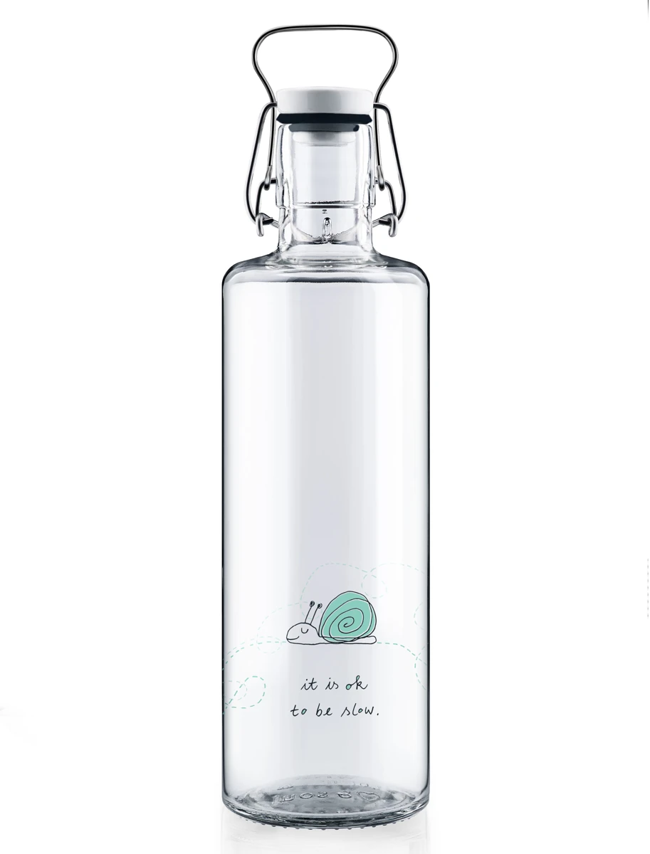 Die spülmaschinenfeste Trinkflasche 'ok to be slow' mit Edelstahl Tragegriff von soulbottles ist plastikfrei, geschmacksneutral, auslaufsicher, vegan, spülmaschinenfest, wird klimaneutral und fair produziert.