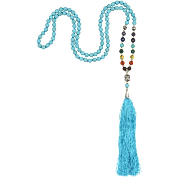 Diese farbenfrohe Mala-Kette mit Türkis sorgt garantiert für gute Laune: Die 7 Chakra-Steine symbolisieren die sieben Energiezentren im Körper. Die Mala besitzt 108 einzeln verknotete Perlen und ist mit einer türkisen Quaste sowie einem kleinen, silberfarbenen Buddha-Kopf verziert.
