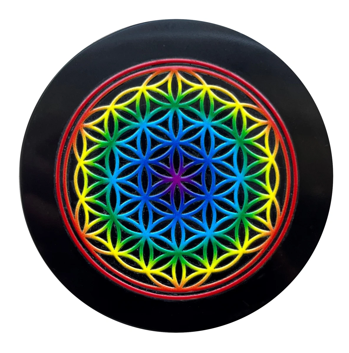 Untersetzer Blume des Lebens in Chakra Farben bedruckt, Onyx schwarz, 8cm