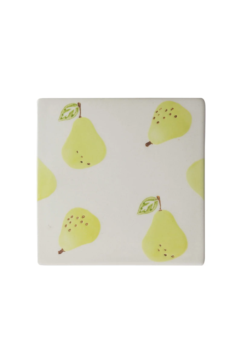 The coaster is decorated with a detailed pear motif. The pears are in warm, natural colours and are reminiscent of a classic orchard. Each pear is carefully designed to bring out the beauty and freshness of the fruit. The design of the coaster is inspired by traditional garden imagery and brings a romantic and cosy atmosphere to your home. The hand-painted details and slightly weathered look give the coaster an authentic vintage charm.