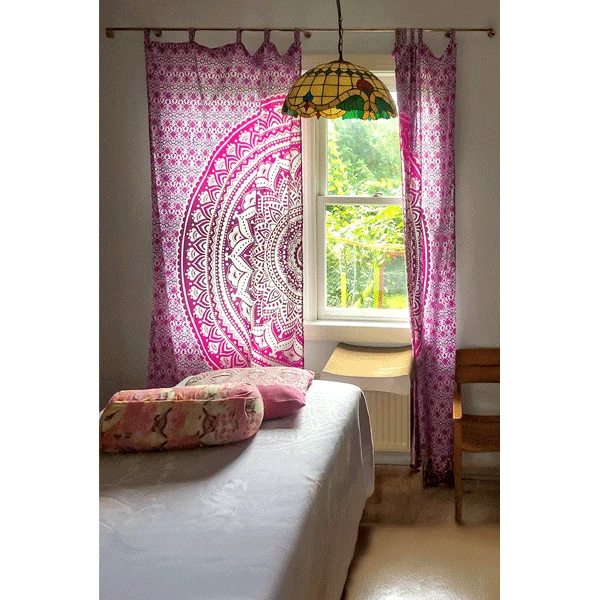 Der Vorhang bringt mit seinen freundlichen und lebendigen Farben eine faszinierende Atmosphäre. Die Kombination aus Lila und sanftem Rosa sorgt für ein harmonisches Zusammenspiel, das sowohl edel als auch einladend wirkt. Das kunstvolle Mandala-Muster verleiht dem Vorhang eine edle und beruhigende Ausstrahlung, die ideal ist, um Wohn- und Rückzugsbereiche harmonisch zu gestalten. Hergestellt aus hochwertiger Baumwolle und mit viel Sorgfalt in Handarbeit bedruckt, ist dieser Vorhang ein einzigartiges Dekoelement für alle, die den Charme echter Handwerkskunst schätzen. Blickdicht & lichtdurchlässig.
