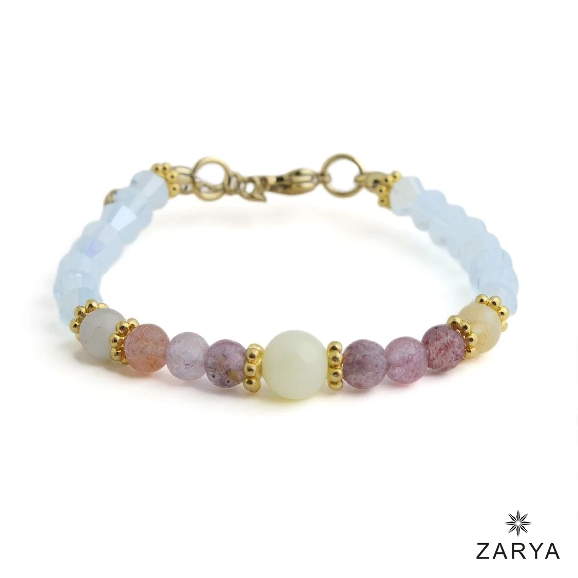 Dieses handgefertigte Edelstein-Armband, inspiriert von der ausgleichenden und ästhetischen Energie des Sternzeichens Waage, vereint die sanfte Kraft der gelben Jade mit der liebevollen Ausstrahlung des facettierten Erdbeerquarzes und dem sanften Glanz der White Opal Glitter Preciosa Kristalle. Vergoldete Zwischenelemente und Miyuki Rocailles Perlen runden das Design mit stilvoller Eleganz ab.
