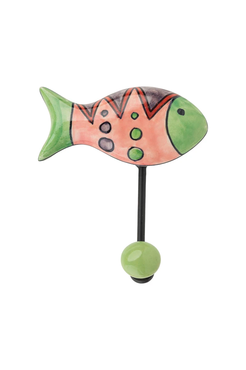 Dieser Wandhaken kombiniert handgefertigte Keramik mit robustem Metall und besticht durch sein verspieltes Fischdesign. Der obere Teil besteht aus einer farbenfrohen Keramikfigur in Form eines Fisches, deren Kopf und Schwanzflosse in einem frischen Grün gehalten sind, während der Körper in zarten Rosatönen leuchtet. Schwarze und grüne Details, wie Punkte und Zickzack-Muster, verleihen dem Design zusätzliche Dynamik und einen charmant-verspielten Look. Der Haken selbst besteht aus schwarzem Metall und endet in einer kugelförmigen grünen Keramikverzierung, die den Look harmonisch abrundet. Dieses dekorative Accessoire bringt nicht nur Funktionalität, sondern auch Fröhlichkeit und Individualität in jedem Wohnraum. Perfekt, um Taschen, Schals oder andere leichte Gegenstände stilvoll aufzuhängen.
