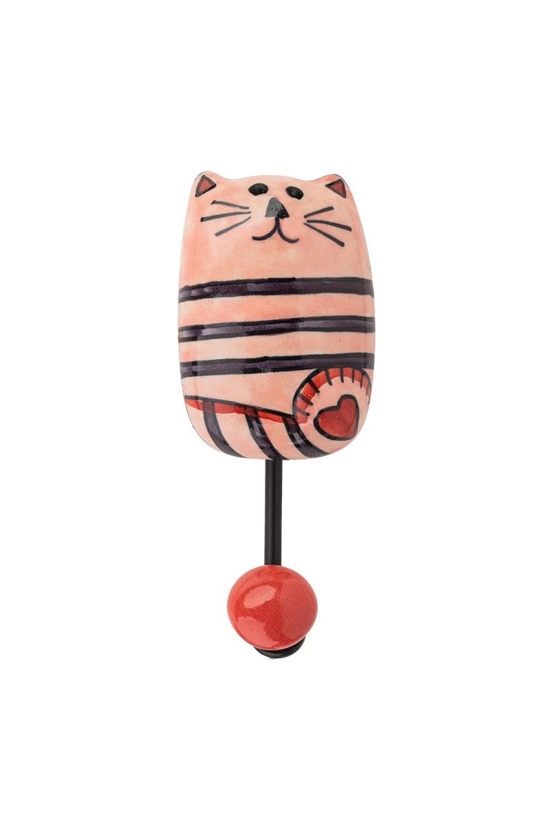 This charming wall hook in the shape of a cat combines functionality with artistic elegance. The upper part, made of finely crafted ceramic, shows a stylized cat in a soft pink. The surface is decorated with curved, flowing patterns that give the design a dynamic and elegant look. The cat's head is richly detailed, giving the figurine a charming expression that immediately catches the eye. The hook itself is made of robust, black lacquered metal, which forms a simple and stable base. At the bottom of the hook is a round ceramic ball, also in pink, which harmoniously complements the design. It also protects delicate fabrics or accessories from marks or damage. This wall hook is not only a practical accessory for jackets, bags or scarves, but also a stylish decorative element. With its delicate colors and curved elements, it brings a romantic and playful touch to any room - ideal for anyone who appreciates original design and a personal atmosphere.