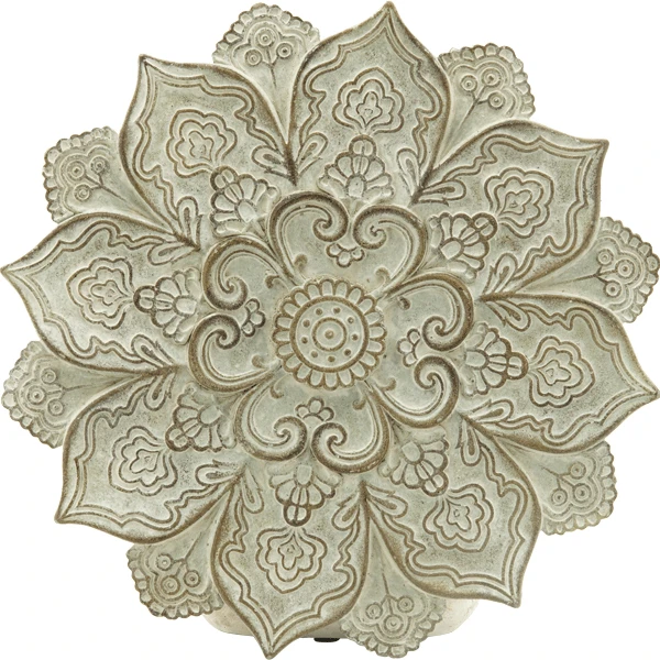 Von orientalischer Kunst inspiriert ist diese harmonische Mandala-Wanddekoration in Stein-Optik. Als ob geöffnete Blütenblätter eines Lotus sich vor dem Betrachter ausbreiten. Mit einem Durchmesser von 35,5 cm passt der Wandhänger nahezu an jeden Platz und ist ein schöner Blickfang auf Ihrer Terrasse, im Wohn- oder Eingangsbereich. Dieser harmonische Wandschmuck hilft, Ruhe und Frieden zu finden.