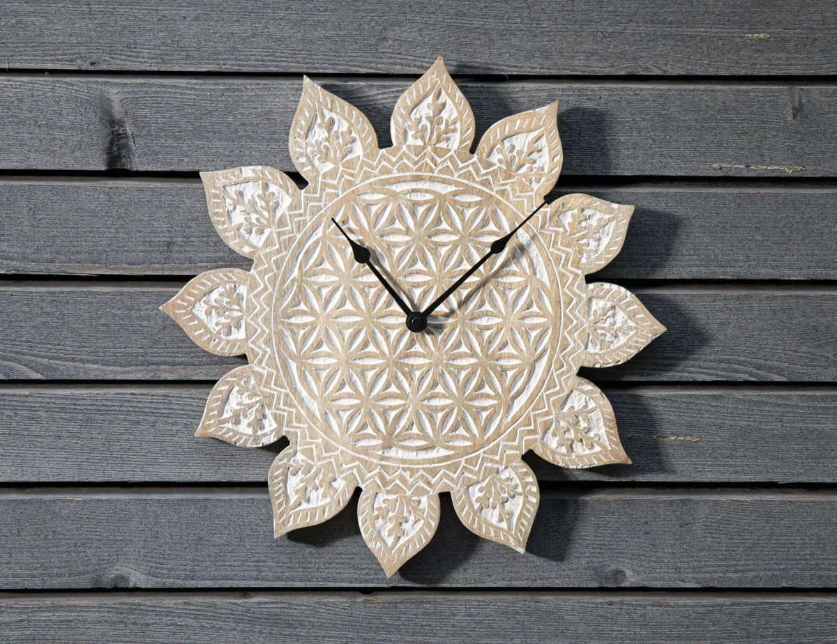 Die Wanduhr Blume des Lebens ist aus Mangoholz und hat einen Durchmesser von 38 cm. Diese aussergewöhnliche Wanduhr wurde von Hand geschnitzt und ist mit der Blume des Lebens verziert. Die Lebensblume ist von zwölf Lotusblättern umrahmt, für jede Stunde ein Blatt. Die Uhr wird mit einer AA Batterie betrieben (nicht enthalten).