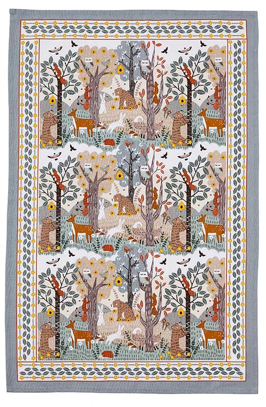 A beautiful Tea Towel created by the northern Irish company Ulster Weavers, with a design of the popular woodland theme features in cool tones of blue and green. These are subtly contrasted by warming browns and oranges to give a sense of seasonal change within the kitchen.