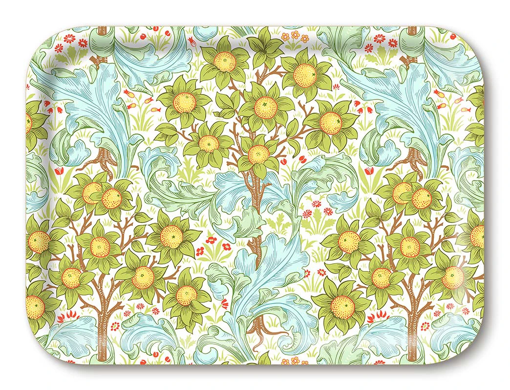 This intricate pattern features bountiful orange trees, bursting with fruit, surrounded by glorious curling acanthus leaves on a delicate floral background. John Henry Dearle designed Orchard in 1899 and is a striking example of his artistic brilliance.