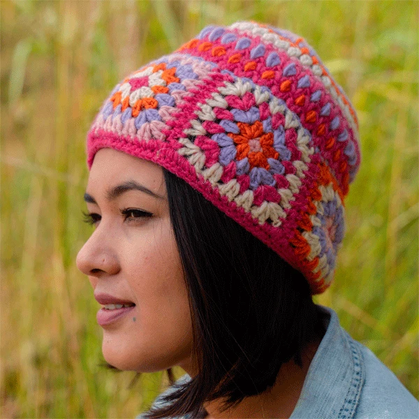 Ein Beanie mit Charakter: liebevoll von Hand gehäkelt, aus reiner Wolle und fair gefertigt in Nepal. Die klassischen Granny Squares machen jedes Stück einzigartig. Innen sorgt ein weiches Fleece-Futter für angenehme Wärme – perfekt für kalte Tage, an denen Stil und Wohlgefühl zusammengehören.
