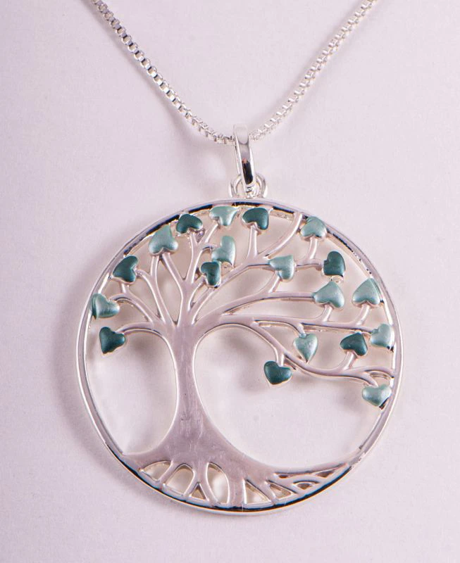Der Yggdrasil Anhänger ist ein edler Halsschmuck. Die grünen Blätter des Lebensbaum sind in Herzform und symbolisieren die tiefe Verbundenheit von Mensch und Natur.