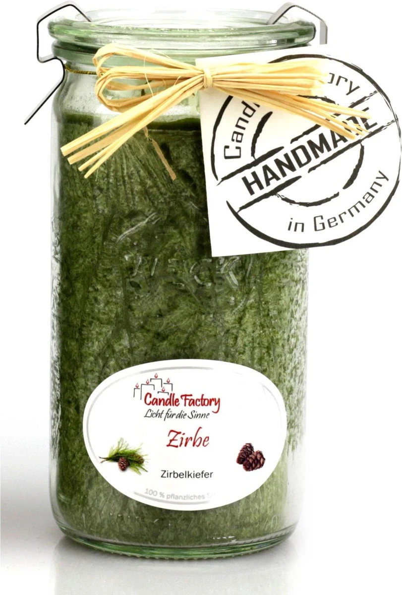 Der Duft der Zirbe mit ihrem wunderbaren, milden und waldfrischen Aroma wurde in dieser Stearin-Kerze der Candle Factory eingefangen. Nach dem Öffnen des Deckels verströmt sich bereits ein angenehmer Zirbenduft. Zusammen mit dem Licht der Kerze, der beruhigenden Farbe Grün und dem Hauch von Zirbenduft ist Wohlfühlatmosphäre garantiert. Diese schöne Kerze im originellen Weck-Glas mit Deckel ist eine tolle Geschenkidee.