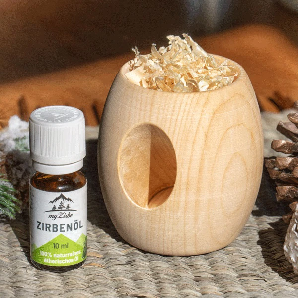 Lieferumfang: Zirbenfässchen und Zirbenflocken aus nachhaltiger Forstwirtschaft, 10 ml Zirbenöl 100% naturbelassen.