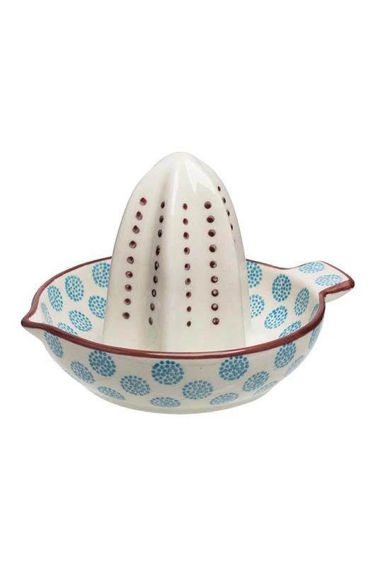 Get the most out of your fruit with our beautiful RETRO-style citrus juicer. Our juicer has a hand-stamped design that will bring joy to your kitchen. The stoneware material feels good in the hand and the rim catches the juice perfectly.